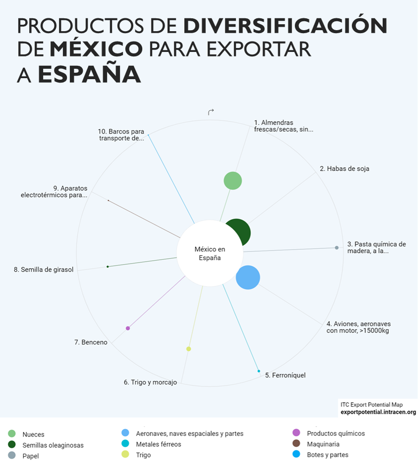 Algunas de las principales oportunidades que identificamos en Export CG para la diversificación de productos mexicanos de exportación a España son las almendras frescas/secas, sin cáscara, Habas de soja y Pasta química de madera.
