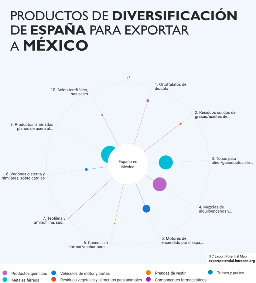 Algunas de las principales oportunidades que identificamos en Export CG para la diversificación de productos españoles de exportación a México son los productos químicos, tubos para gasoductos, cascos para sombreros de fieltro, vagones tipo cisterna y productos laminados de acero al silicio. Los productos laminados planos de acero al silicio, >=600mm, son el producto que se enfrenta al mayor potencial de demanda en México.